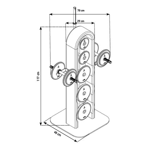 Notre tour d'haltères WeightPlate Tower est une combinaison design de bois massif, d'acier thermolaqué et d'acier inoxydable brossé – une conception unique pour tout espace de fitness. La tour offre de l'espace de stockage pour des plaques de poids individuels et des haltères entièrement chargés (dumblers) pour garder la salle de fitness bien rangée. Les barres d'haltères (pumpers) sont rangées en toute sécurité sur le dos et à la verticale.